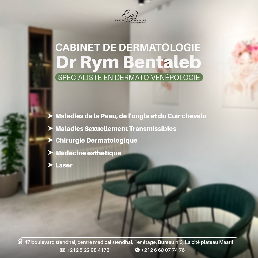 Docteure Rym Bentaleb, dermatologue, lauréate de la faculté de Médecine de l'université Mohammed V de Rabat et Hassan II de Casablanca, spécialisée dans : - Maladies de la peau, de l'ongle et du cuir chevelu, - Maladies sexuellement transmissibles, - Chirurgie dermatologique, - Médecine esthétique, - Laser.